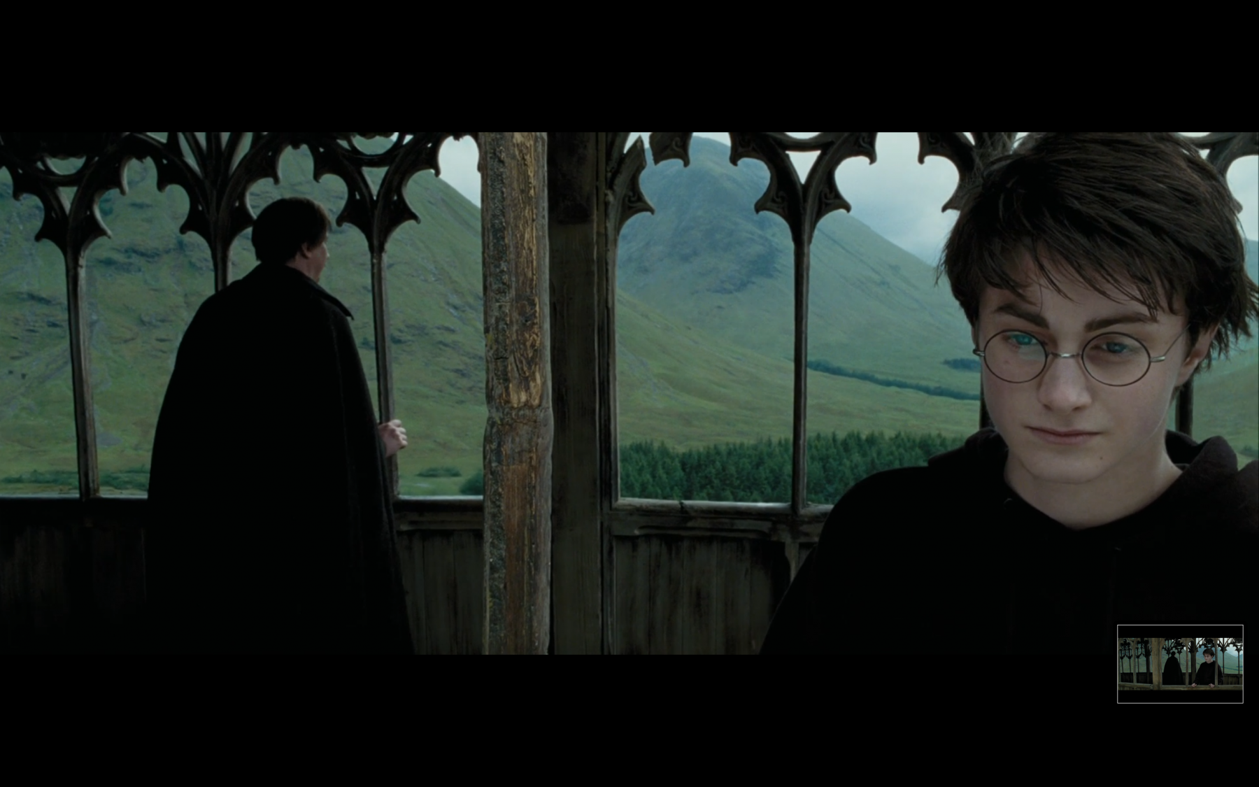 We are gonna start our analysis with the camera work. There’s only four shots composing the scene, that starts in the Hogwarts Clock Tower Courtyard. The other characters leave the castle heading for a day trip, although Harry is not allowed. They leave him alone, just when the clock hits the hour and a (probably digital) owl flies just above him. It’s a wide moving shot that works perfectly with the clock used as the transition. The dialogue starts, followed by a long establishing wide shot that shows the bridge located in the Scottish Highlands. The main two characters are in the middle of it.