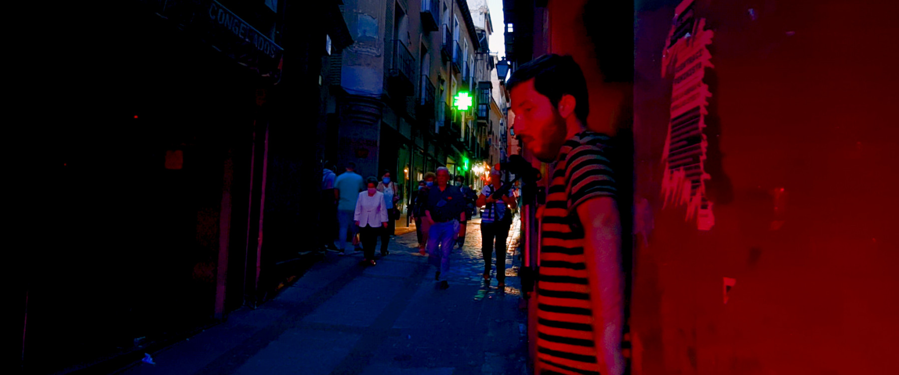 Completely stressed, Daniel realised he had forgot something in the car and, as he always does, got angry with himself. Some things never change. That gave me the idea. What about a new sequence, shot in Toledo’s Old Town, about a shady character walking the streets… without revealing where he was headed or who he is? We started filming, trying to get some homenage to Kubrick’s tracking shots and Tarantino “camera inside box” technique. Also some pull focus, although any of the shots worked in the final version. And the editing time came, that same night.